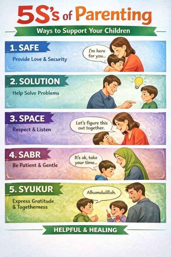 These 5S’s — Safe, Solution, Space, Sabr, Syukur — help you nurture your child’s emotional, spiritual, and mental wellbeing the Islamic way.