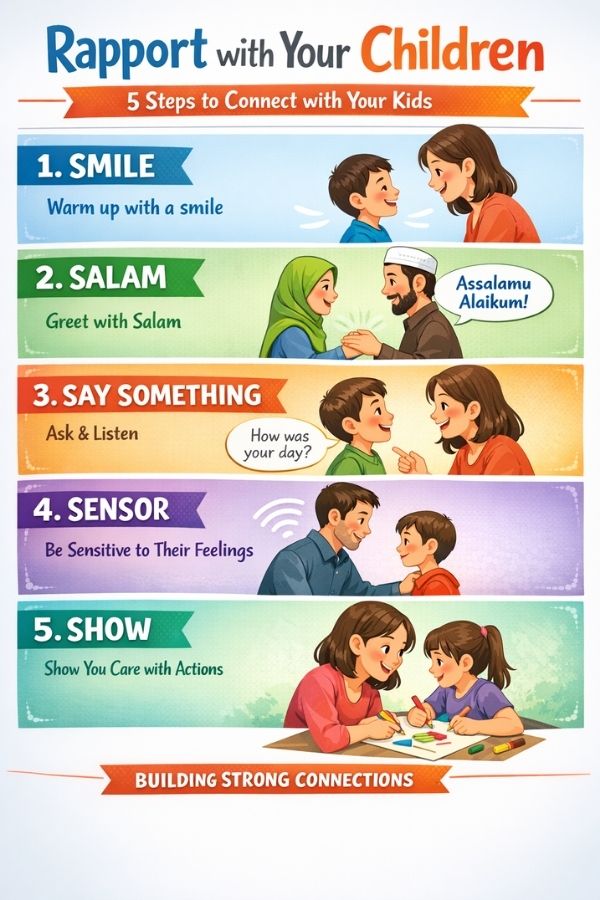 The Prophet ﷺ taught us that warmth and gentleness open hearts. Practice the 5S of connection — Smile, Salam, Say Something, Sensor, Show — to strengthen your relationship with your children every day.